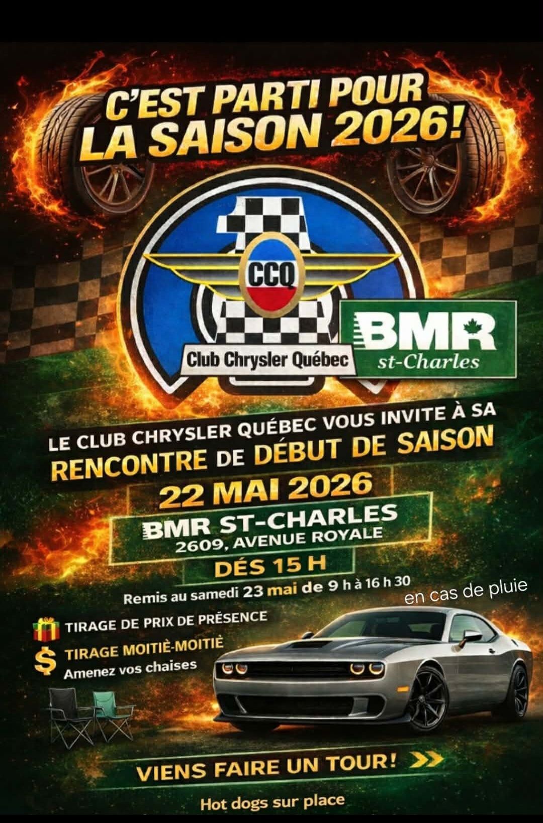 Pour toutes informations, nous vous invitons à communiquer avec l'équipe du Club Chrysler Québec via la page Facebook du Club Chrysler Québec. L'événement se tiendra au BMR de Saint-Charles le 22 mai 2026 dès 15h. En cas de pluie, l'événement est remis au 23 mai à 9h.